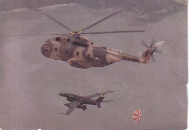 Osan AB Korea, Fall of 1974. I believe it was SSgt Scott and I that were asked to fly with the back-up CH-3 Helicopter for one of the AQM34R Drone Recovery’s, we did the flight and returned to Osan AB late in the afternoon but instead of landing the Air Crew decided they had enough fuel to do a few touch and go’s with some auto rotation landings.